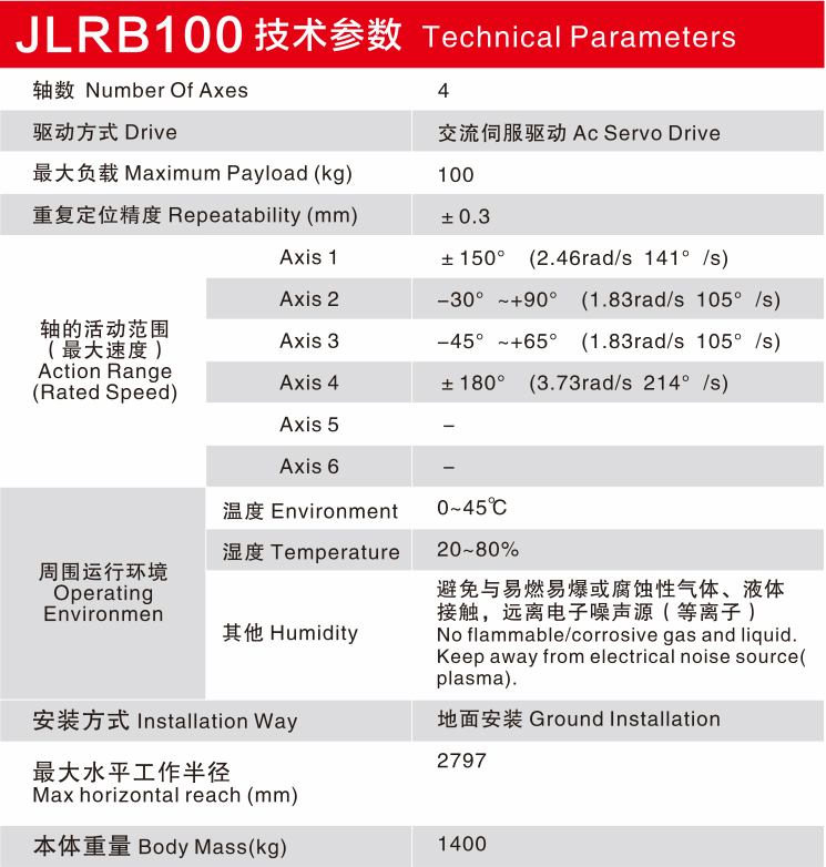 JLRB100特性:手腕負載能力為100Kg,最大工作半徑為2797mm。