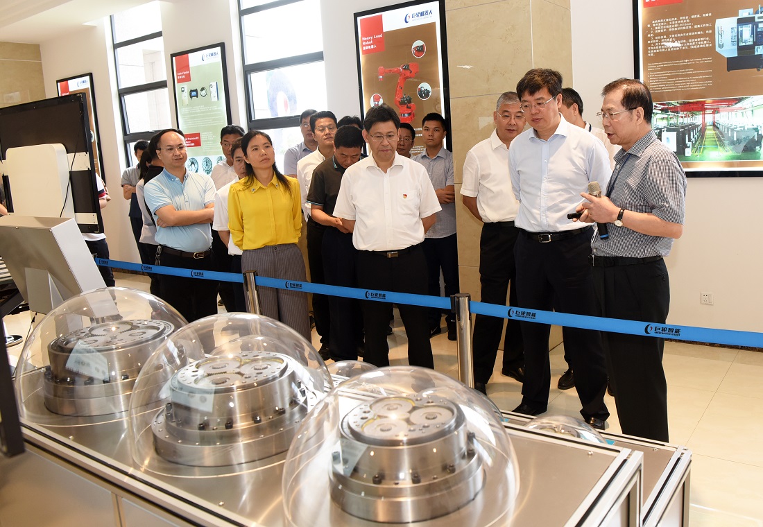 在吳董事長的陪同下,省市各級領導依次觀看了公司六自由度工業機器人舞獅表演、鞋業自動化生產線以及機器人在各個工業領域上的應用演示。吳董事長向調研組領導介紹到:巨輪中德機器人智能製造有限公司(下稱巨輪中德公司)於2016年在廣東省揭陽市中德金屬生態城注冊成立,是巨輪智能裝備股份有限公司的全資子公司,主要從事工業機器人及其核心部件、控製係統、柔性自動化技術開發、製造,是巨輪智能在智能裝備產業化方麵的重要平台。