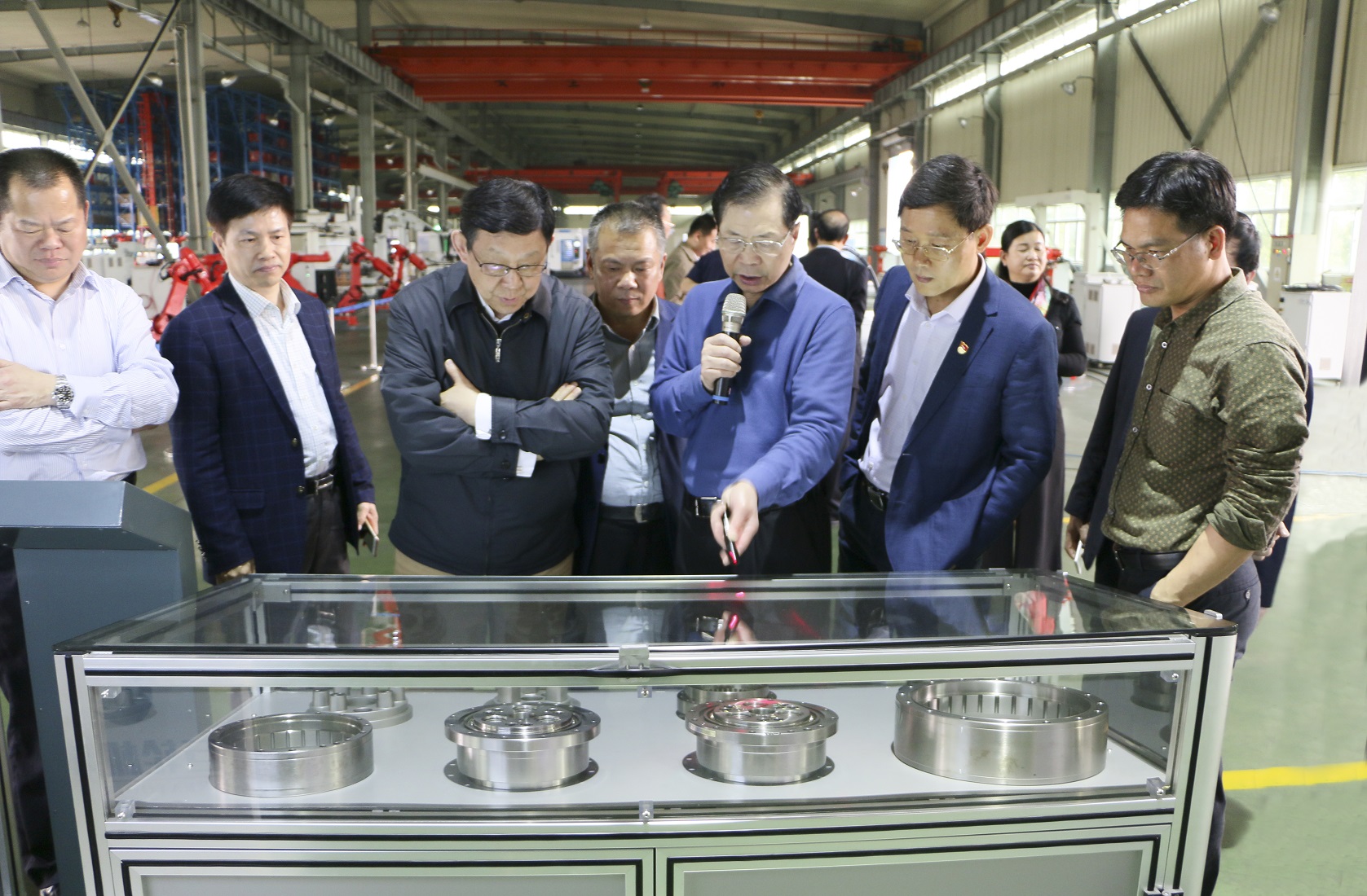 在機器人車間,各位領導來賓們首先觀看了栩栩如生的機器人舞獅表演,隨後在自動化立體倉庫、鑽攻自動化生產線、高速雕銑加工中心、機器人五子棋對弈等演示前駐足,並近距離觀看了RV減速器及控製係統等機器人核心部件、機器人視覺係統以及工業機器人在各行業、各ge領ling域yu的de應ying用yong案an例li等deng。參can觀guan過guo程cheng中zhong,陳chen德de銘ming會hui長chang不bu斷duan與yu吳wu董dong事shi長chang進jin行xing交jiao流liu,對dui機ji器qi人ren在zai實shi際ji生sheng產chan中zhong的de應ying用yong提ti出chu感gan興xing趣qu的de問wen題ti。吳wu董dong事shi長chang熱re情qing地di為wei陳chen會hui長chang解jie答da疑yi問wen,並bing向xiang客ke人ren著zhe重zhong介jie紹shao了le巨ju輪lun智zhi能neng自zi主zhu研yan發fa的de新xin型xingRV減速器。該類型的RVjiansuqishigongsijingguoduonianchixutouruheqianxinkaifaerchenggongyanzhide,juyoujianshaomocalixiaohao,jianxiaofareliangdetedian,tigaoleshuchuxiaolv,jiangdizongchengben,tigaokekaoxing,yanchangchanpindeshiyongshouming。zaijiegou、空間設計實現創新,不僅提高可靠性,降低總成本,還可以方便地獲得範圍較大的傳動比,同時具有扭矩剛性大、振動小、耐衝擊性強、傳動效率高等特點,更好地滿足工業機器人尤其是六自由度工業機器人的傳動需求。