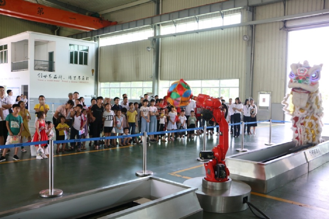 座zuo談tan會hui結jie束shu後hou,家jia屬shu們men在zai工gong作zuo人ren員yuan的de組zu織zhi下xia來lai到dao大da家jia最zui期qi待dai與yu好hao奇qi的de工gong業ye機ji器qi人ren車che間jian。隨sui著zhe工gong業ye信xin息xi與yu智zhi能neng化hua的de不bu斷duan發fa展zhan,巨ju輪lun緊jin跟gen時shi代dai步bu伐fa,走zou在zai了le科ke技ji的de前qian沿yan,本ben次ci活huo動dong向xiang家jia屬shu們men展zhan示shi了le公gong司si近jin年nian來lai的de研yan究jiu成cheng果guo。走zou進jin機ji器qi人ren車che間jian,首shou先xian映ying入ru眼yan簾lian的de是shi舞wu獅shi表biao演yan,隨sui著zhe《男兒當自強》的鏗鏘節奏,兩隻機器人獅子靈活舞動,其高敏捷性、高一致性、高(gao)穩(wen)定(ding)性(xing)的(de)表(biao)演(yan)可(ke)謂(wei)精(jing)彩(cai)絕(jue)倫(lun),使(shi)得(de)所(suo)有(you)人(ren)都(dou)駐(zhu)足(zu)觀(guan)看(kan),並(bing)紛(fen)紛(fen)拿(na)起(qi)手(shou)機(ji)拍(pai)攝(she)下(xia)來(lai)。隨(sui)後(hou)陸(lu)續(xu)展(zhan)示(shi)各(ge)類(lei)機(ji)器(qi)人(ren)在(zai)工(gong)業(ye)生(sheng)產(chan)方(fang)麵(mian)的(de)應(ying)用(yong),包(bao)括(kuo)搬(ban)運(yun)、噴塗、電焊、切割、立體倉庫、貨物分揀等,令員工家屬們歎為觀止,最後變形金剛隆重登場,全體小朋友為之歡呼雀躍。