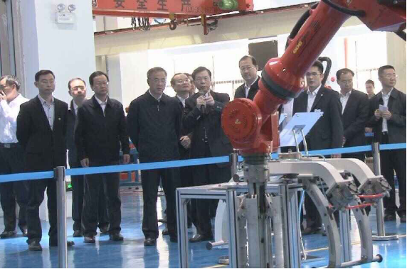 With the company of chairman WU and his explanation along way, ChunHua, Hu visited the rich kinds of robot application cases including Double Della Robots cooperative Work, Six Degrees Freedom Robot Perform Sword, Laser cutting, Weld Robot Application, Articulated Arm Teaching, Robot Polishing, Robot imitation and welding, AGV Automatic Logistics Line, Robot handling fixture replacement tires and Stereoscopic warehouse. In the cooperative product area of Sino-German, chairman Wu introduced to HU about the achievements which have obtained the national PTC patent, including High-speed five-axis milling machine carving, drilling and tapping machining centers and automated machining cell phone, and the flexible production control unit training platform that was provided for Tsinghua University. Hu stayed for a long time in front of the robot visual system, asking chairman Wu about its operational principle in a lot of interest. This kind of robot visual system was composed of a six degrees freedom robot and a visual system. According to the already collected messages from the picture, our groups extracted Workpiece feature parameter specifically, identified the types of workpiece and judge the position and gesture of the workpiece, the robot finally made the workpiece to be intelligently identified and processed.