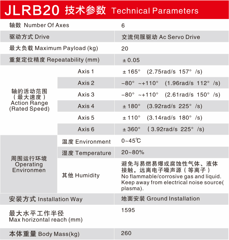 JLRB20 features: lightly and ingeniously structured, payload is 20 kg, maximum working radius of 1595 mm, wrist joints with high precision harmonic reducer.